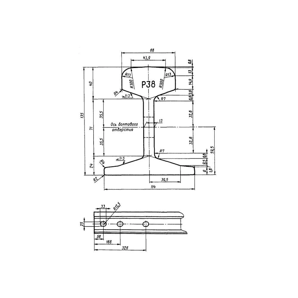 Мы продаем железнодорожный рельс Р38, отгружая со своего склада в Грозном продукцию, отвечающую всем действующим нормативам. Согласно ГОСТ 30165-94 и ДСТУ 2539-94, габаритные размеры данного металлопроката составляют 135 мм. в высоту и 114 мм. в ширину (ширина основания). Толщина головки при этом составляет 68 мм., толщина шейки – 13 мм. Рельсы Р38 отгружаются заказчикам в зависимости от приобретаемого тоннажа: при мерной длине в 12,5 метров масса одной рельсы составляет около 481 кг. При необходимости мы готовы поставить заказчику прокат немерной длины – отрезками от 4 до 12 метров.